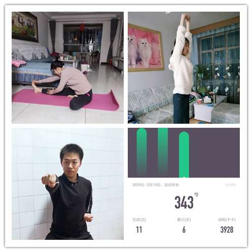 健身强体力,强身健体养正气。学院发起了“抗疫情天天练”线上打卡群以及健身打卡小程序,鼓励师生锻炼身体,健康身心。跳绳、瑜伽、深蹲……疫情期间,大家不宜在户外健身,客厅就成了临时健身场所,师生们做到了居家学习、工作和健身相结合,以此保持身心健康,提高免疫力。同时,学院也倡导师生们积极练习八段锦。身在武汉的2018级李娟同学不仅自己练习八段锦,还教会了父母,她说“爸妈配合度极高,日日勤练”。2019级的安永铖同学说 “攒拳怒目增气力为八段锦中第七式,此式能激发肝经经气,使肝气得疏,肝血得充,有强筋健骨之效。”王鹤淞、谯英固同学每日在健身小程序上打卡,收获到老师和同学们的点赞鼓励。老师们也积极踊跃在群里打卡,每天都不落下。老师和同学们都相互激励,坚持锻炼。