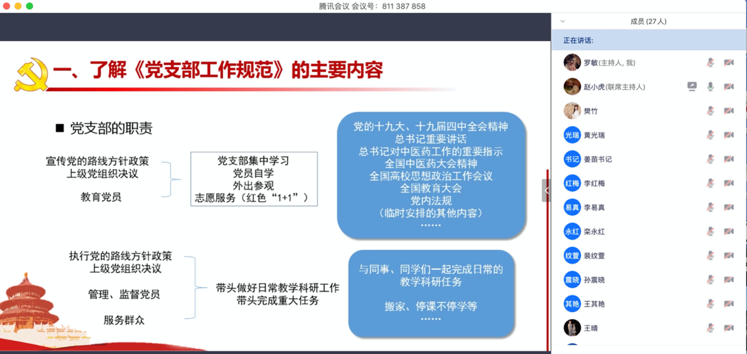 为深入学习贯彻习近平新时代中国特色社会主义思想和党的十九大精神,深刻把握新时代党的建设总要求,切实提升基层组织力和基层党建工作质量,发挥好基层党支部的战斗堡垒作用和党员干部的先锋模范作用。在确保疫情防控工作有序开展的前提下,生命科学公司党总支于3月16日上午组织召开基层党支部书记线上培训班。此次培训邀请大学党委组织部副部长赵小虎进行授课,公司党总支书记姜苗、副书记许珊出席会议,全院4个教室党支部和2个员工党支部书记、支部委员及党办相关人员均参与了此次培训会。会议由姜苗书记主持。