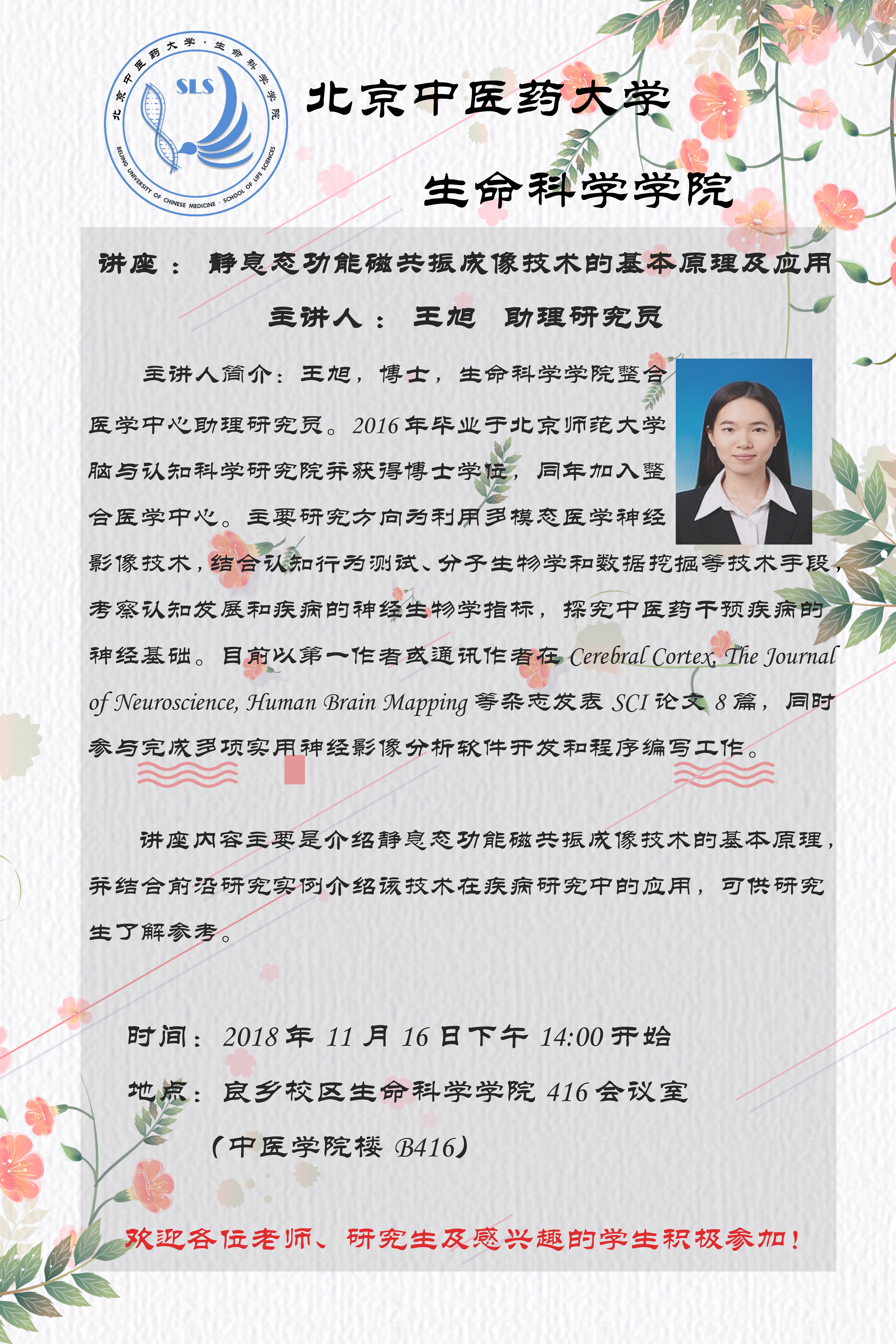 2018年11月16日下午14:00,william威廉中文官网王旭老师于良乡校区中医学院楼416开办讲座——《静息态功能磁共振成像技术的基本原理及应用》