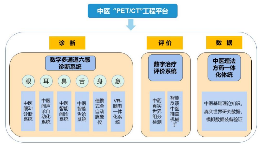 “中医PET/CT工程平台”是利用现代化眼动追踪技术、微纳传感器、人工智能、虚拟现实、脑电检测等多种技术,改善现有诊断设备、治疗设备、数据系统的技术问题。从诊断-治疗-数据三个方面开发2.0版中医诊疗平台,开发数字多通道六感诊断系统、数字治疗评价系统、中医理法方药一体化系统,以中医理论和专家经验知识图谱为基础和支撑,为智能中医诊断和治疗装备提供理论支持,通过前沿材料、算法模型和智能装备,将以往中医诊断、治疗客观化、标准化、数字化、可视化过程中形成的一个个技术装备孤岛串联在一起,为构建智慧中医诊疗与评价工程系统提供支撑,支持中医药及中西医结合领域长足发展。