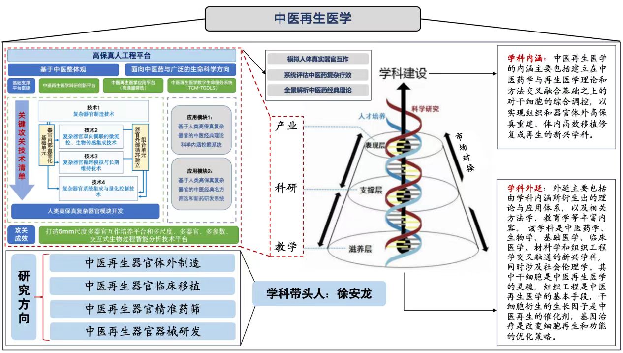 申报建设“中医再生医学”新学科,其内涵主要包括建立在中医药学与再生医学理论和方法交叉融合基础之上的对干细胞的综合调控,以实现组织和器官体外高保真重建、体内高效移植修复或再生的新兴学科。该学科以中医“元精-元气论”为理论指导,通过开发“益气填精”中药小分子组方促同源干细胞定向分化,聚焦攻关体外高保真器官制造、互联、血管化和集成交互四大关键问题,创制“整体观”模式下的高保真人复杂器官系统用于面向中医药和广泛生命科学领域的医药研发与临床应用。其外延主要包括由学科内涵所衍生出的理论与应用体系,以及相关方法学、教育学等丰富内容。该学科是中医药学、生物学、基础医学、临床医学、材料学和组织工程学交叉融通的新兴学科,同时涉及社会伦理学。学科已确定“中医再生器官体外制造”、“中医再生器官临床移植”、“中医再生器官精准药筛”和“中医再生器官器械研发”为四大研究方向,聚力打造国家级高保真人复杂器官智能制造产业桥头堡。