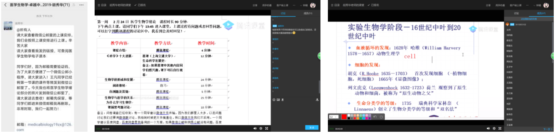 《医员工物学》课程组课前进行了多种软件平台的调试,并利用公共邮箱发布学习资料,便于同学们随时下载学习。课程开始后先对整体课程的内容、时间安排进行总述,结合线上慕课资源开展课堂内容,尤其是对重难点进行汇总讲解。