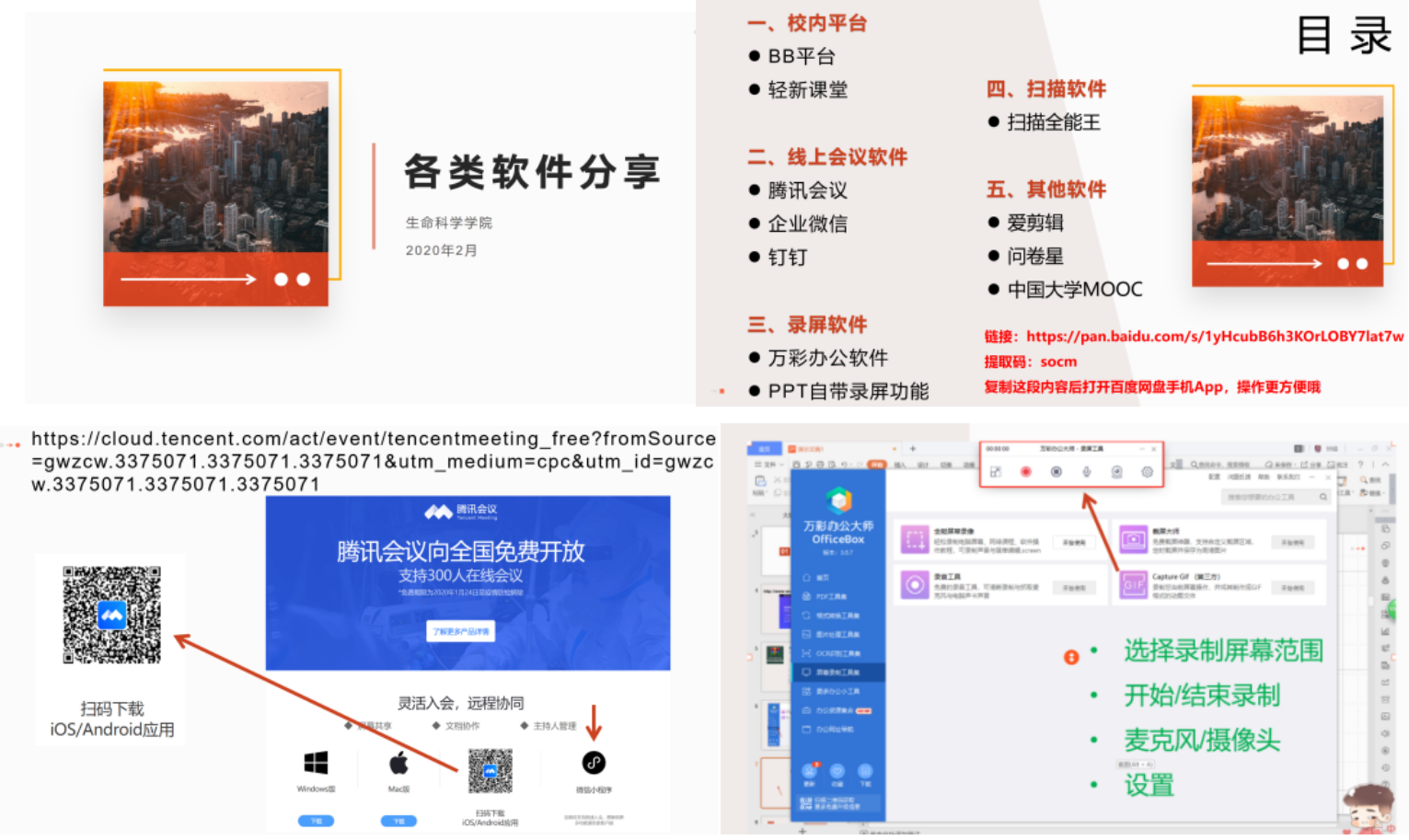 随着教学手段科技化、教育传播信息化、教学方式现代化以及线上教学模式的兴起,william威廉中文官网办公室始终做好服务保障工作,提前根据教师可能出现的需求对各类软件平台进行分类和测评,按照校内平台、线上会议软件、录屏软件、扫描软件、其他软件等五大类择优整理成目录与教程,将电脑版安装包上传至百度网盘进行分享,极大地节省教师们的时间,同时也提高了学院整体的信息化能力水平。