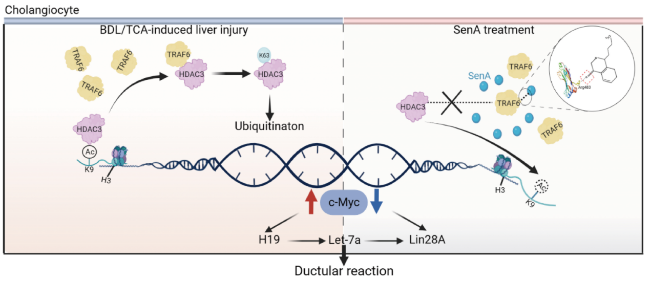 课题组多年来聚焦川芎提取物及代表性成分的抗肝纤维化及肝损伤作用研究,并取得系列研究成果。川芎具有活血行气、祛风止痛的功效,可用于治疗胸痹心痛及肝郁气滞等病。川芎主要包含生物碱、酚酸及苯酞类活性成分,其中洋川芎内酯A为川芎代表性苯酞类成分。胆汁淤积性肝病是多种肝胆类疾病的共同病理特征,但目前仍缺乏有效的治疗手段。本研究通过CHIP-qPCR、Co-IP、胆管细胞转录组测序及化合物变构合成等方法证明:(1)SenA可有效抑制BDL引起的小鼠体内肝损伤及胆管细胞异常增殖及TCA诱导的胆管反应;(2)SenA通过抑制c-MYC及下游LncH19、Let-7a及Lin28a减轻胆管细胞异常增殖;(3)SenA中羰基可结合TRAF6中Arg483位点,破坏TRAF6与HDAC3结合,从而降低了HDAC3泛素化,增加HDAC3与c-MYC启动子区域结合,最终导致组蛋白去乙酰化及c-MYC转录抑制。