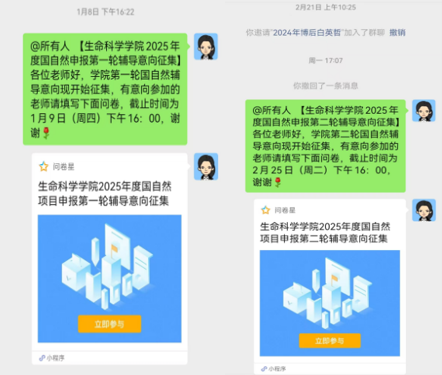 为使项目申报人能够进一步提升项目标书撰写质量,项目申报期间,学院分别于2025年1月8日、2025年2月21日收集两轮国自然标书辅导意向,并根据申报人的意向及申报研究方向进行辅导专家匹配,安排“一对一”精准辅导,并将于3月初邀请专家组织进行“多对一”辅导。