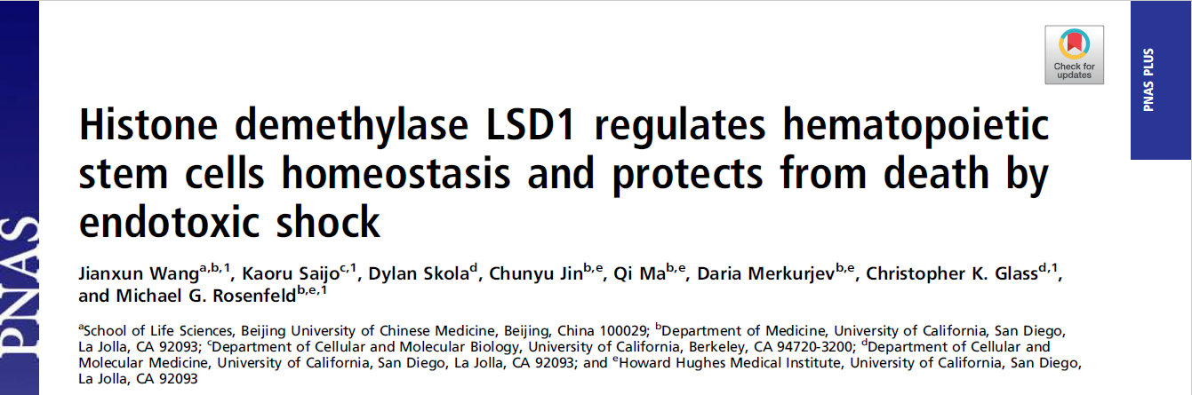2017年12月20日,以公司特聘教授王建勋教授为通讯作者,北京中医药老员工命科学学院为第一完成单位,题为“Histone demethylase LSD1 regulates hematopoietic stem cells homeostasis and protects from death by endotoxin shock”一文,发表于四大名刊之一的《美国科学院院报》(PNAS)。