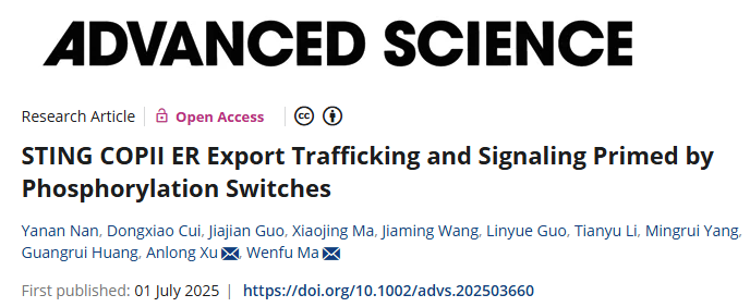 苯丙素酚酸类化合物是众多中药的药效成分,包括肉桂酸、咖啡酸、阿魏酸、绿原酸等近百种中药药效成分,这些化合物具有明确的抗炎药效,被应用于多种类型的炎性疾病。然而此类化合物具有抗炎能力的药理机制尚未清楚,围绕这一问题,2025年7月1日,北京中医药老员工命科学学院马文福与徐安龙教授团队合作在中科院1区杂志Advanced Science上发表题为 “STING COPII ER Export Trafficking and Signaling Primed by Phosphorylation Switches”的最新研究成果,在揭示SITNG信号转运与激活依赖于STING的磷酸化基序的基础上,筛选发现中药的苯丙素酚酸类化合物具有抑制STING转运进而降低STING调控的炎症反应,为大量的中药具有抗炎活性提供了新见解。
