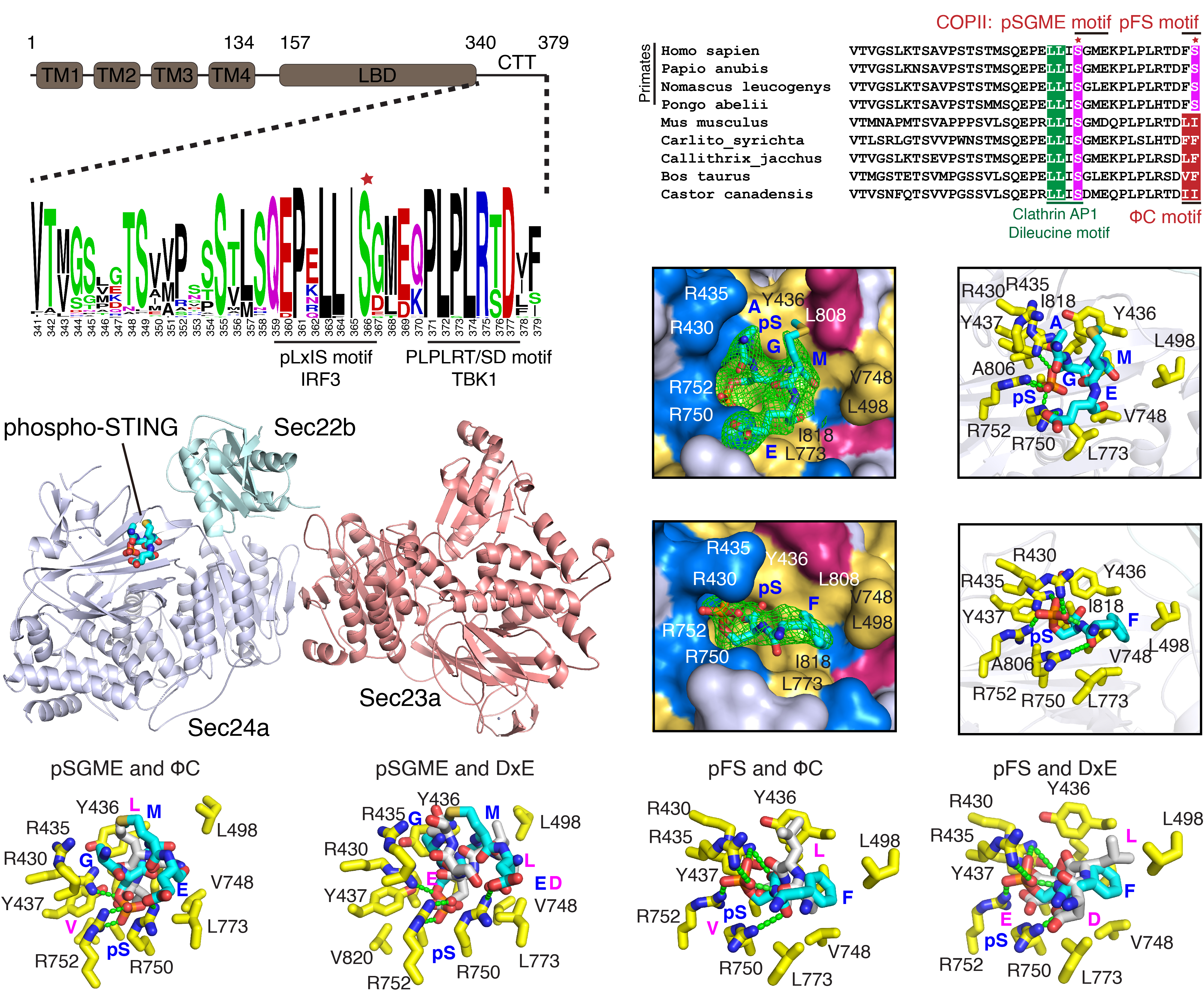 该研究首次揭示了STING通过磷酸化依赖的两种COPII分选信号(pSGME和pFS)实现内质网-高尔基体转运的分子机制。研究发现,STING的内质网驻留依赖于COPII与COPI介导的动态转运,而cGAMP激活STING后,COPII介导的正向转运增强,推动STING向内质网-高尔基体中间体及顺式高尔基体转运。通过晶体结构解析和细胞功能实验验证,团队鉴定出两个TBK1磷酸化的COPII分选信号:在哺乳动物中保守的pSGME和灵长类特有的pFS,这些分选信号通过与COPII Sec24亚基特异性结合,实现了STING的精确定位和转运调控。