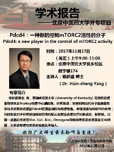 【学术报告】杨新盛 教授——Pdcd4:一种新的控制mTORC2活性的分子