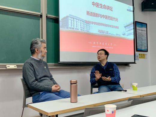 随后,张教授与卢涛教授围绕这一主题展开讨论。卢教授从生命科学的角度提出了关于肠道菌群的看法,并从生理、健康方面分析了肠道菌群的功效,给与会师生带来了新的启发。