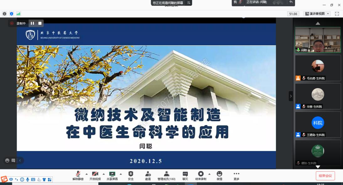 本次活动邀请了王建勋经理做了主题为《肿瘤和免疫研究平台》的报告。同时,邀请闫聪老师做了《微纳技术及智能制造在中医生命科学的应用》的报告,王旭老师做了《中医人工智能图像处理的初步探索》报告,甄建华老师做了《中医体质相关的肠道菌群结构与功能特征》报告,张越老师做了《中药来源纳米颗粒与生物屏障的相互作用》报告,朱莉莉做了《冥想对脑功能影响》报告。