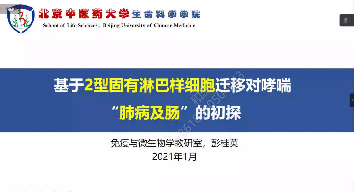 彭桂英老师作了题为《基于2型固有淋巴样细胞迁移对哮喘“肺病及肠”的初探》的报告,研究方向为免疫细胞在不同组织器官间的迁移以及组织器官的免疫区域特性,中医药对肠道菌群以及宿主免疫系统相互作用的调控,中药单体对免疫细胞的分化与效应干预机制研究。