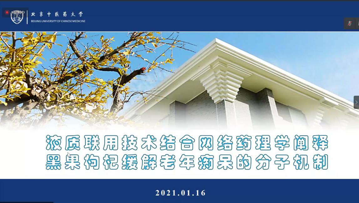 于国华老师作了题为《液质联用技术结合网络药理学阐释黑果枸杞缓解老年痴呆的分子机制》报告。首先介绍了老年痴呆的研究背景以及目前治疗方案,黑果枸杞具有养肝明目、补肾填精、延缓衰老的功效,液质联用技术对化合物进行鉴别及靶点预测,采用蛋白相互作用分析、功能富集分析,构建成分-靶标-通路关系图进行机制预测,并简要介绍后续实验安排。