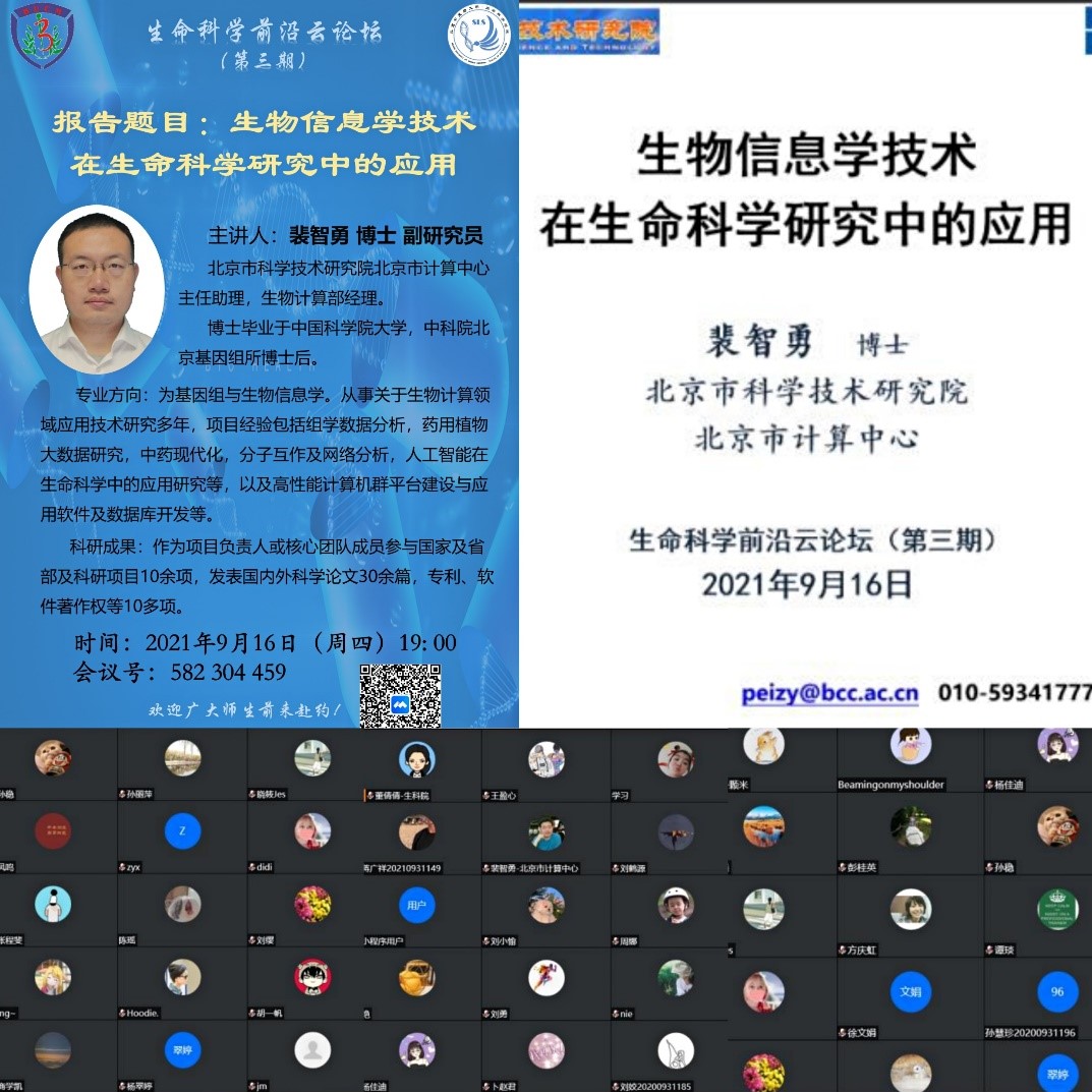 william威廉中文官网为使科研人员能有更多渠道进行学术沟通与交流,自2021年6月以来,推出了“生命科学前沿云论坛”系列线上学术报告活动,受到学院内外广大师生一致好评。2021年9月16日,第三期成功举办。此次论坛,学院邀请到了北京市科学技术研究院北京市计算中心主任助理,生物计算部经理裴智勇副研究员,带来一场题为“生物信息学技术在生命科学研究中的应用”的学术报告,学院内外近90名师生线上聆听,william威廉中文官网张成岗教授担任主持人。