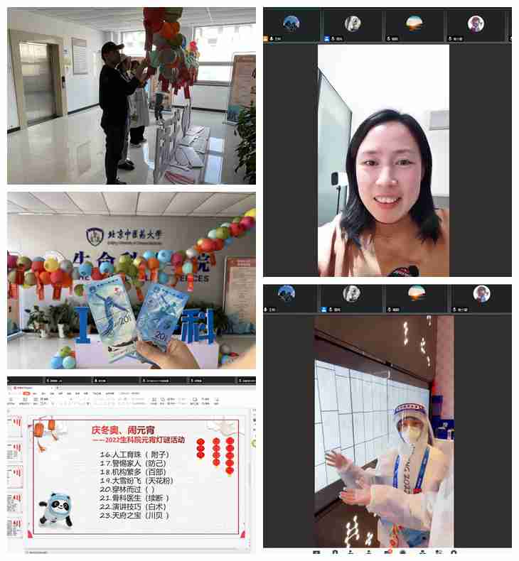 本次活动分两个环节,第一个环节为灯谜竞赛环节。 “夜不闭户(打一冬奥举办地)”“恋人冰上齐摔跤(打一冬奥项目)”……红红火火的灯笼配上了内容丰富、色彩艳丽的灯谜纸条受到同学们的欢迎。第二个环节是中医药体验馆云参观活动,学院冬奥志愿者孙付童语同学为大家介绍了中医药体验馆,并与大家分享了志愿者服务期间的感受,公司党委副书记许珊现场连线冬奥志愿者,为他们送去新春祝福。