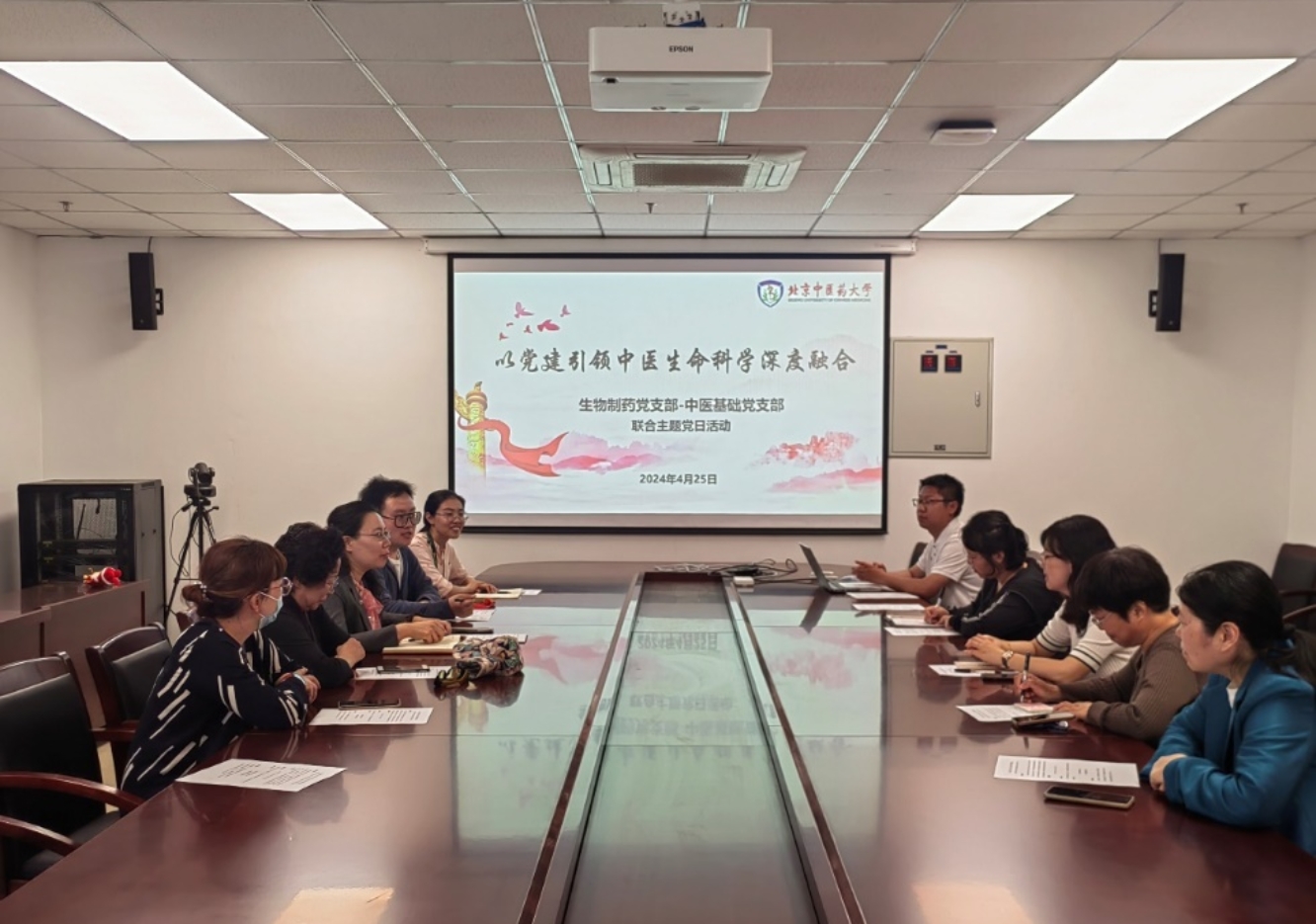 首先,生物制药党支部与中医基础党支部党员进行了交流座谈。会议由生物制药党支部毛伯龑老师主持。会上,生物制药党支部书记卢天公与中医基础党支部书记田甜分别介绍了各自党支部的情况与特色。双方支部成员依次进行自我介绍,并结合自身研究经历,对中医药现代化的理解进行了深入的交流,共同探讨中医生命科学的交叉融合思路与合作方向。